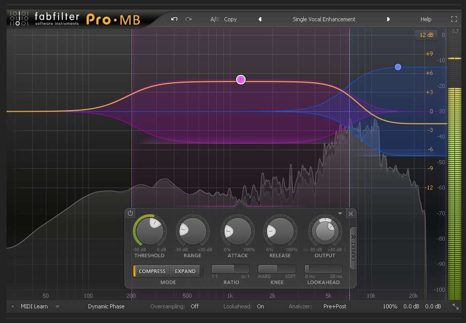 Range是正值的时候,是向上扩展。当信号一旦超过阈值,就会被增加,这会增强音频的峰值。但是,当信号降至阈值以下时,它却不会衰减信号。这增加了阈值向上的动态范围。向上扩展是增强瞬态的好方法。例如,您使用向上扩展,可以很容易地,增加鼓声的冲击力。