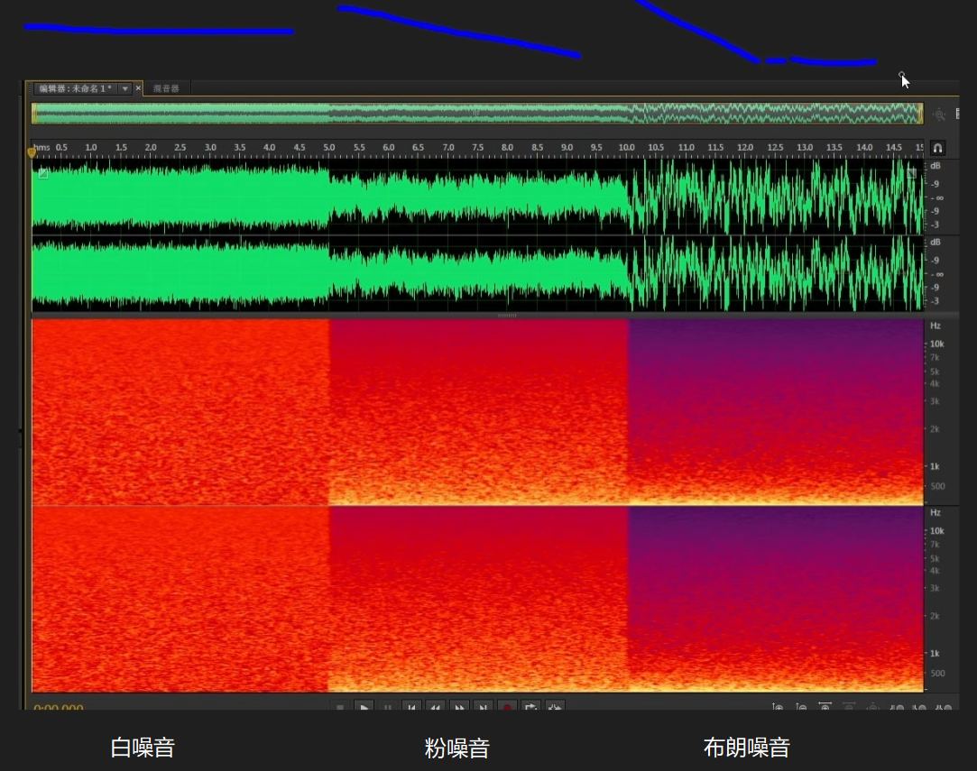 - Pink:粉噪声。特点:从低频到高频,能量逐渐衰减。听起来响度均等。