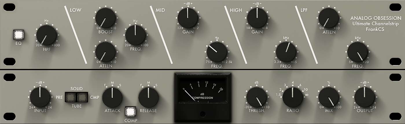 FrankCS:通道条,拥有电子管放大器+EQ均衡器+电子管压缩器。分别源于Helios、Pultec、API和Neve,插件将它们的最佳频率结合在了一起。 - Analog Obsession