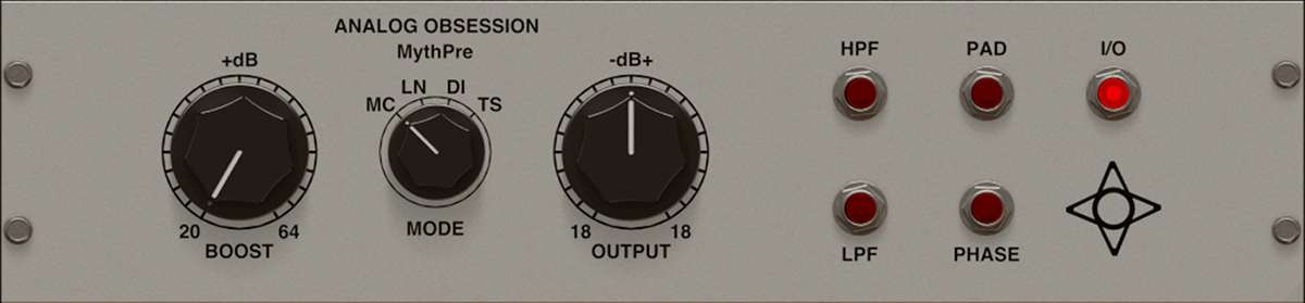 Analog Obsession MythPre:低频增强的电子管话放,旨在为音频制作提供饱满的低频响应。持四种输入模式(MC话筒、LN线路、DI直通和TS音色塑形),每种模式针对特定低频特性进行优化;核心控制包括带增益补偿的BOOST输入电平、纯净的OUTPUT输出电平、MODE输入类型选择,以及前置增益级的高低通滤波器(HPF和LPF)、-20dB衰减开关(PAD)和相位反转功能(PHASE)。
