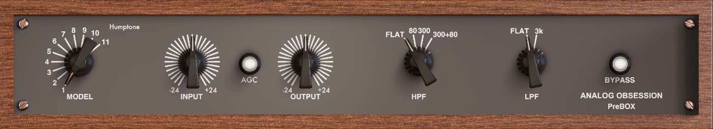 Analog Obsession PreBOX:放大失真效果器,提供 11 种话放(话筒前置放大器)模型,输入电平范围为-24dB 到 24dB,输出电平范围为-24dB 到 24dB,并配备可切换的 HPF(FLAT/80Hz/300Hz/300+80Hz)和 LPF(FLAT/3kHz)滤波器,同样支持四倍过采样和可调整界面大小。