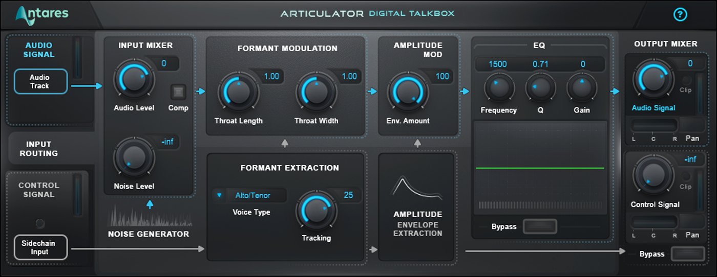 Antares Avox Articulator:是一款数字“Talkbox(话筒盒)”效果插件,它通过从人声控制信号中提取共振峰(formant)和振幅包络(amplitude envelope),并将其实时应用于音频信号(如合成器、吉他等)或内置噪声发生器,从而实现“会说话的乐器”或特殊音效。Articulator 使用两个输入信号: