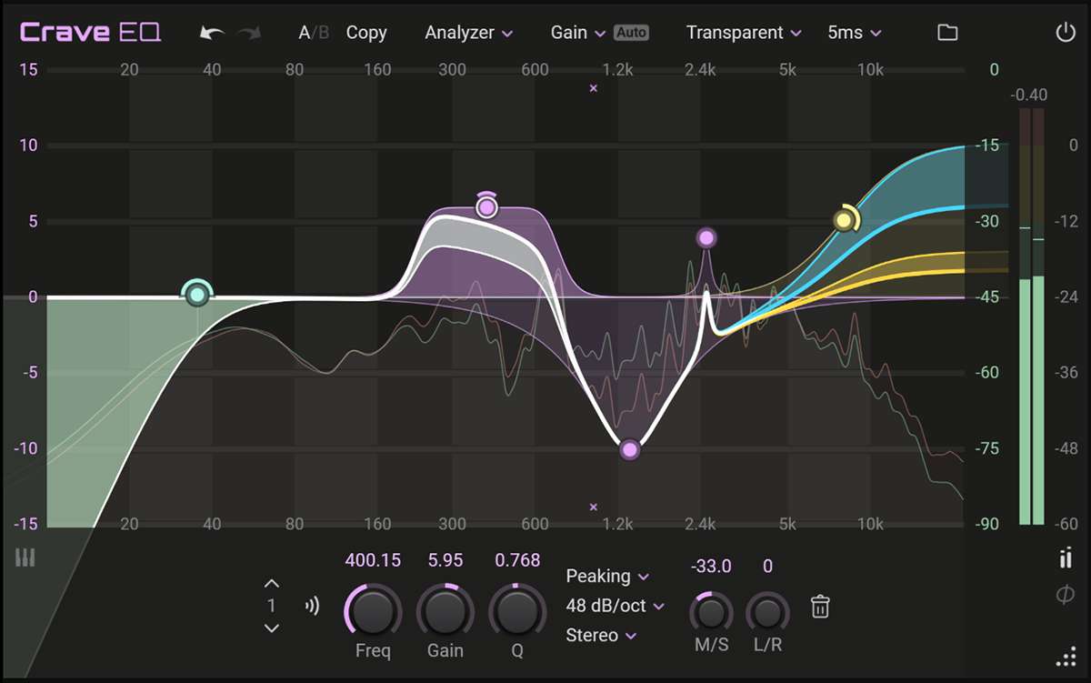 - Transparent:数字魔法结合了低端的平滑模拟滤波和高端的线性相位处理。当更高的频率在轨道上保持同相时,提供更有凝聚力的混音体验。非常适合在跨轨道应用校正或创意均衡器时保持混音的完整性。