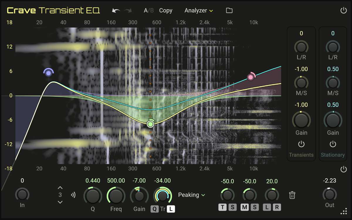 - 瞬态/静态均衡:通过专有算法,音频被精确地分离为瞬态和静态分量,你可以使用每频段 T/S 旋钮独立控制这些分量。比打击乐器的演奏更清晰的细节被揭示出来。例如,在人声轨道上,静态信号将包含所有平滑的音乐元素,而瞬态信号将包含所有刺耳的快速变化的谐波元素。