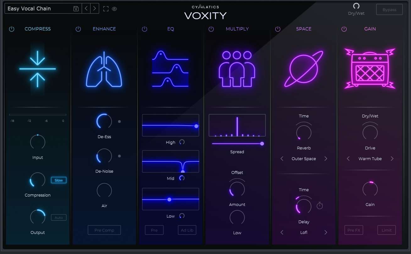 Cymatics Voxity Vocal Mixing Plugin:全能型人声混音插件,提供压缩、增强、均衡等模块化处理,内置全风格预设库,简化专业混音流程。