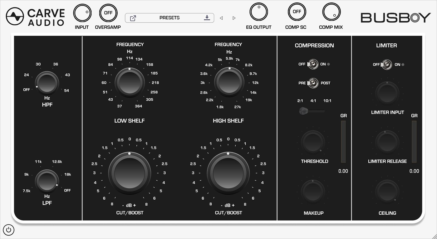 Carve Audio Busboy:专为混音总线(Master Bus)和子编组(如鼓组、人声组等)设计的多功能音频处理插件,旨在通过简洁的界面和高质量的算法,快速为混音增添专业感、凝聚力和控制力。虽然专为总线设计(如主输出总线、鼓组总线、吉他编组),但也适用于单轨处理(如增加贝斯的重量、提升人声的清晰度或增强吉他的冲击力)。