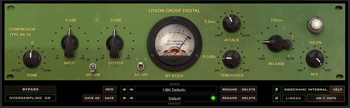 AR-1:电子管压缩插件,能够保持自然流畅的动态响应,同时为声音增添电子管设备特有的温暖和肥厚音色,以及温柔而强大的压缩效果,能够为声音增添独特的质感和凝聚力。 - Kush Audio