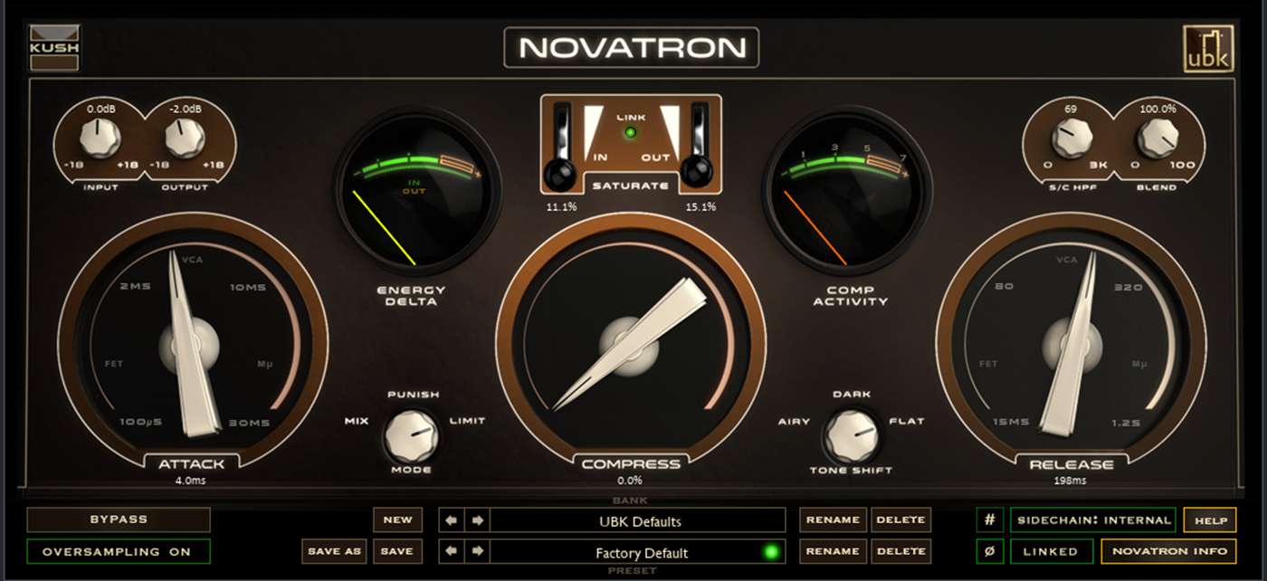 Novatron:可变音色电子管压缩器插件。是一个模拟建模压缩器,它吸纳了很多只存在于 DSP 界的不同经典硬件单元的音色属性。 - Kush Audio