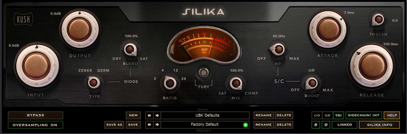 SILIKA:数字双二极管压缩插件,旨在重现老式模拟压缩器的音色特点,尤其强调二极管饱和/失真与压缩的结合。 - Kush Audio