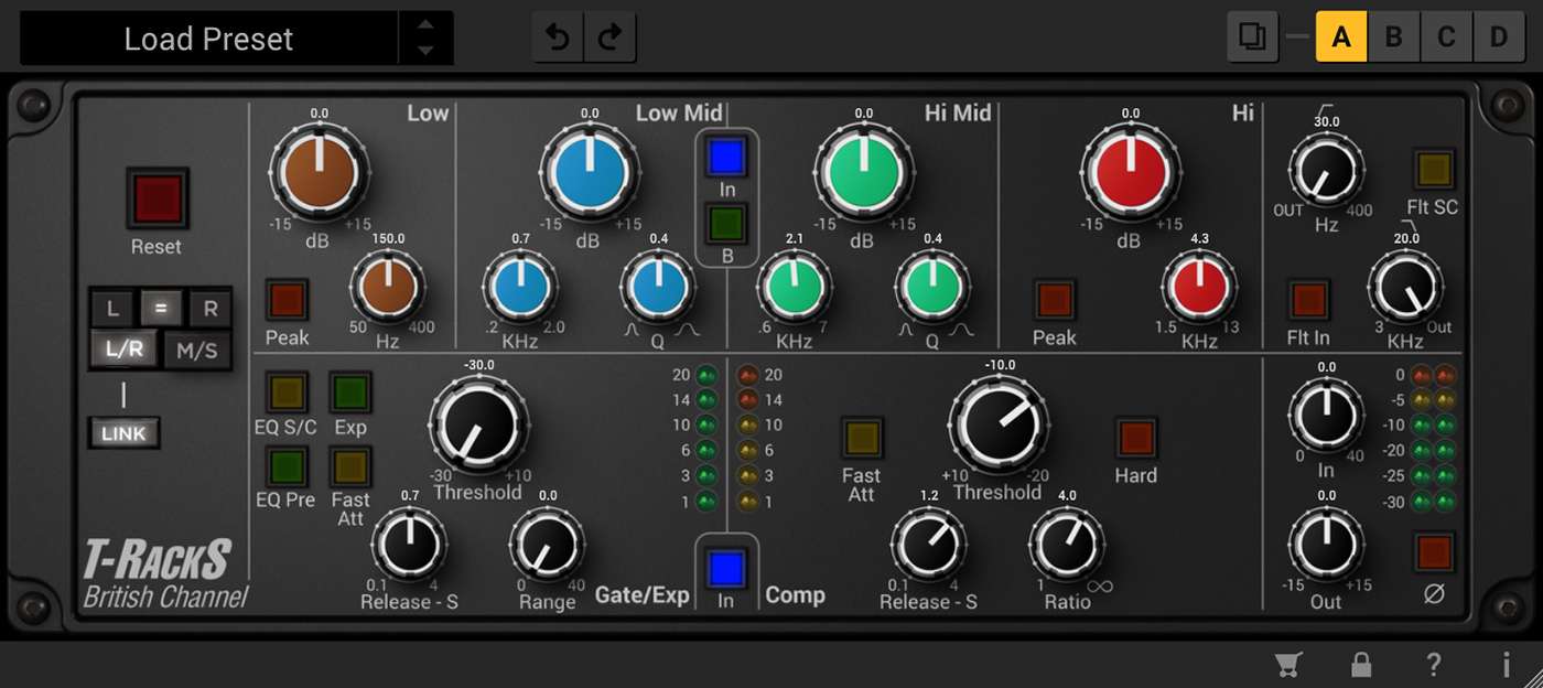 T-RackS British Channel:通道条,模拟英国经典 SSL 调音台。适用增添温暖、饱满和富有音乐性的“英式”色彩。精确复刻了原硬件中运算放大器(op-amp)驱动的均衡器(EQ)和 VCA 压缩器/扩展门(Compressor/Expander-Gate)的行为与声音特性。