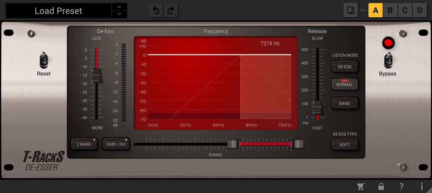 De Esser:专为人声处理设计的齿音消除工具,旨在有效减少或消除人声录音中过于突出的“S”和“T”等齿音,使整体声音更加清晰、平滑,避免刺耳的高频噪音干扰。 - T-RackS