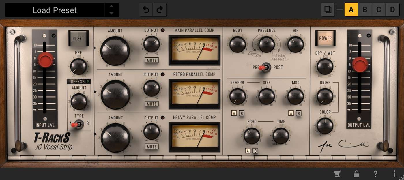 T-RackS Joe Chiccarelli Vocal Strip:人声通道条,由传奇格莱美获奖制作人/工程师 Joe Chiccarelli 与 IK Multimedia 联合开发。集成前置放大器、均衡器、压缩器、去齿音器。