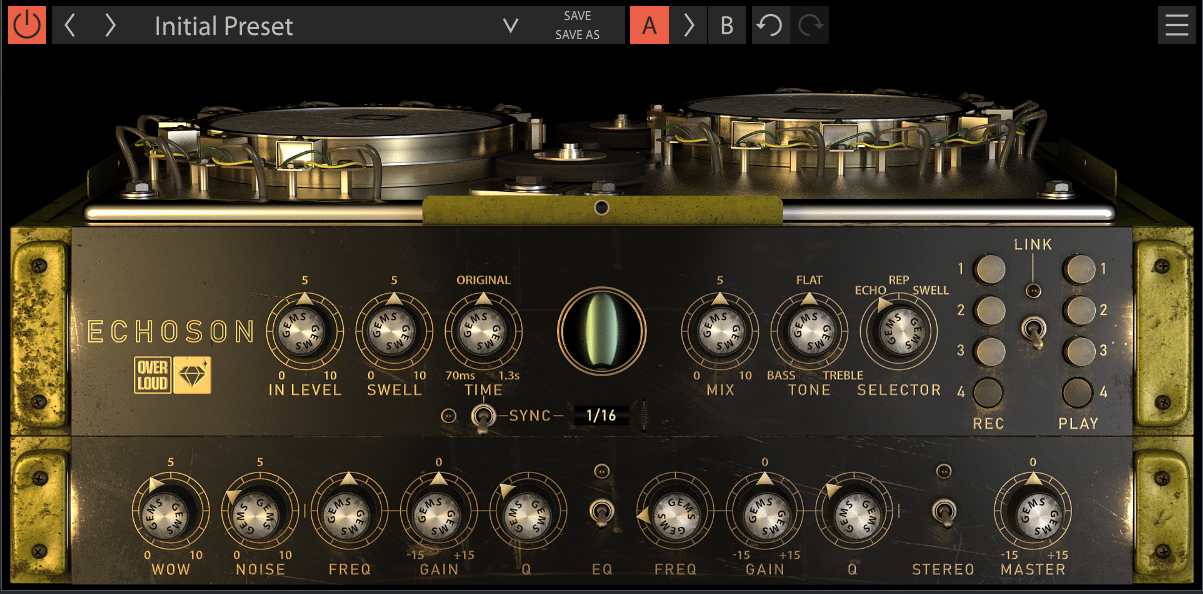 Overloud Gem Echoson:传奇磁鼓延迟。对传奇意大利磁鼓延迟单元的再创作。其独特的音调定义了 70 年代的 Pink Floyd 声音。全新!可调整大小的图形界面,超逼真地再现郁郁葱葱的空灵原音,独立控制每个播放头,立体声操作模式,左右声道单独控制,双单声道、立体声和混响模式允许创建更宽的音景,可调节光盘速度以更改延迟时间,具有 BPM 同步选项,内置参数均衡器,用户可调节的哇音/颤动和电噪声,大量在真实混音会话中设计的预设。