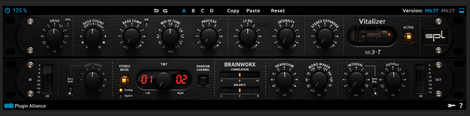 Plugin Alliance SPL Vitalizer MK3-T:专为混音与母带设计的音频增强工具,采用专利心理声学处理技术提升声音清晰度与响度,同时避免失真。Vitalizer MK3-T也是混音终结工具,通过其专利的频率塑形与低频处理组合,让您直观地进行先进且清澈的心理声学处理。始终被信赖为提供那区分优秀混音与卓越混音的最后5%,它能帮助您的混音更突出、更饱满、更精致。除了完整的混音和母带应用外,无论是为人声增色还是收紧鼓组总线的低频,Vitalizer Mk3-T都是添加清晰度、冲击力和声音"最终化"处理的传奇选择。SPL Vitilizer Mk3 提供单声道制作功能,可将指定频点以下的频段编码为单声道,适合母带处理。Headroom 余量功能可以在导出音频或进行额外处理之前,精确设置增益结构。
