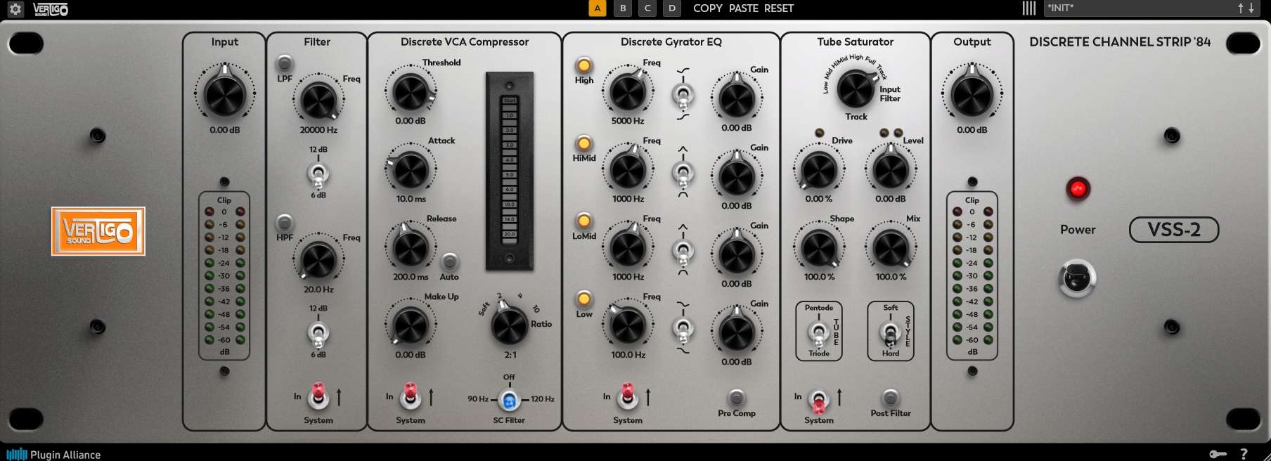 Vertigo VSS-2:离散通道条,该插件融合了高端 Vertigo 模拟硬件系列的多项核心元素。分别是 VSE-2 输入滤波器,用于频率滚降处理;VSC-3 四重VCA压缩器,用于动态控制和增添光泽;VSE-4 Gyrator 均衡器,用于音色塑造;VSM-4 可切换电子管饱和电路。
