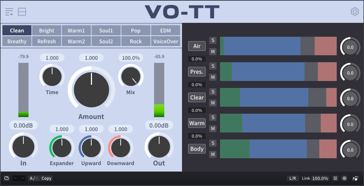 VO-TT 具有五个频段,每个频段专注于人声音色的不同方面。在每个频段中,压缩器(Downward Compressor)控制过于响亮的峰值,反向压缩器(Upward Compressor)微妙地提升较弱的信号,而扩展器(Expander)进一步衰减最安静的声音以减少噪音。这些组件共同作用,使用户的人声呈现专业且频率平衡的效果,在混音中脱颖而出。