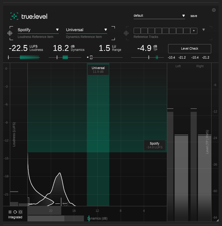 True:level:智能响度和动态测量工具。主要用于可视化响度和动态之间的相互作用,帮助用户判断混合内容是否准备好发布。
