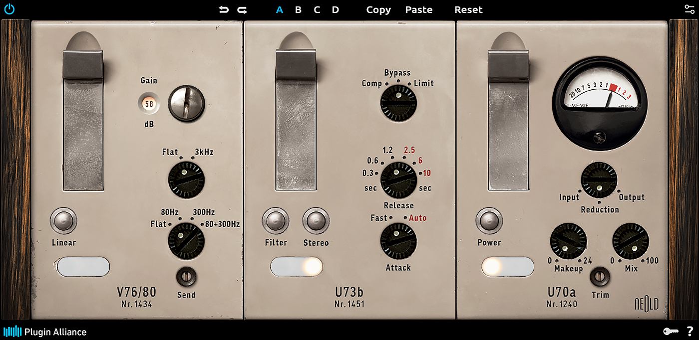 Plugin Alliance Neold V76U73:通道条,精准建模自 1950–60 年代德国广播级经典硬件模块(Telefunken V76 前级放大器+ U73b 压缩器)。