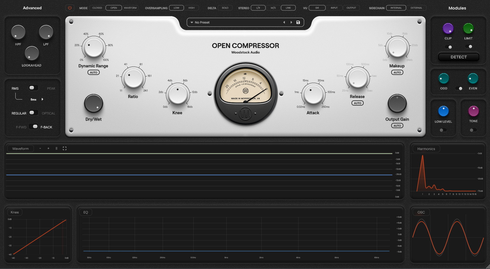提供实时动态处理可视化功能,精细图形显示界面可让用户清晰洞察输入音频的处理过程。主波形显示区呈现增益衰减、削波阈值与限幅阈值,并同步显示信号波形的处理前后的对比视图。频率响应图包含音调曲线与频谱分析器,饱和度显示器则呈现信号中奇次与偶次谐波的含量,拐点显示器则详细展示压缩器的膝点形态及增益衰减状态。示波器视图则实时捕捉最终波形形态。