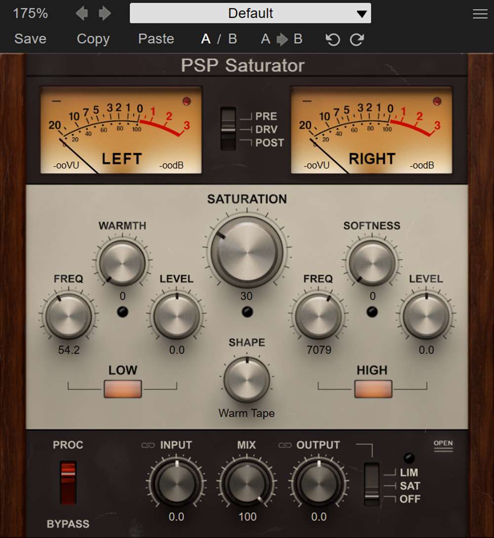 PSP Audioware PSP Saturator:饱和效果器,精准复刻磁带机、电子管(阀)放大器等经典模拟设备在信号过载时产生的谐波染色、软削波与动态压缩特性。通过智能算法,在保留原始音源清晰度的同时,增添恰到好处的“模拟味”。饱和器使用三种算法来模拟这些设备,并提供了八种不同的形状模式,从微妙的“混合魔力”到彻底的音频破坏,都具有很大的灵活性。
