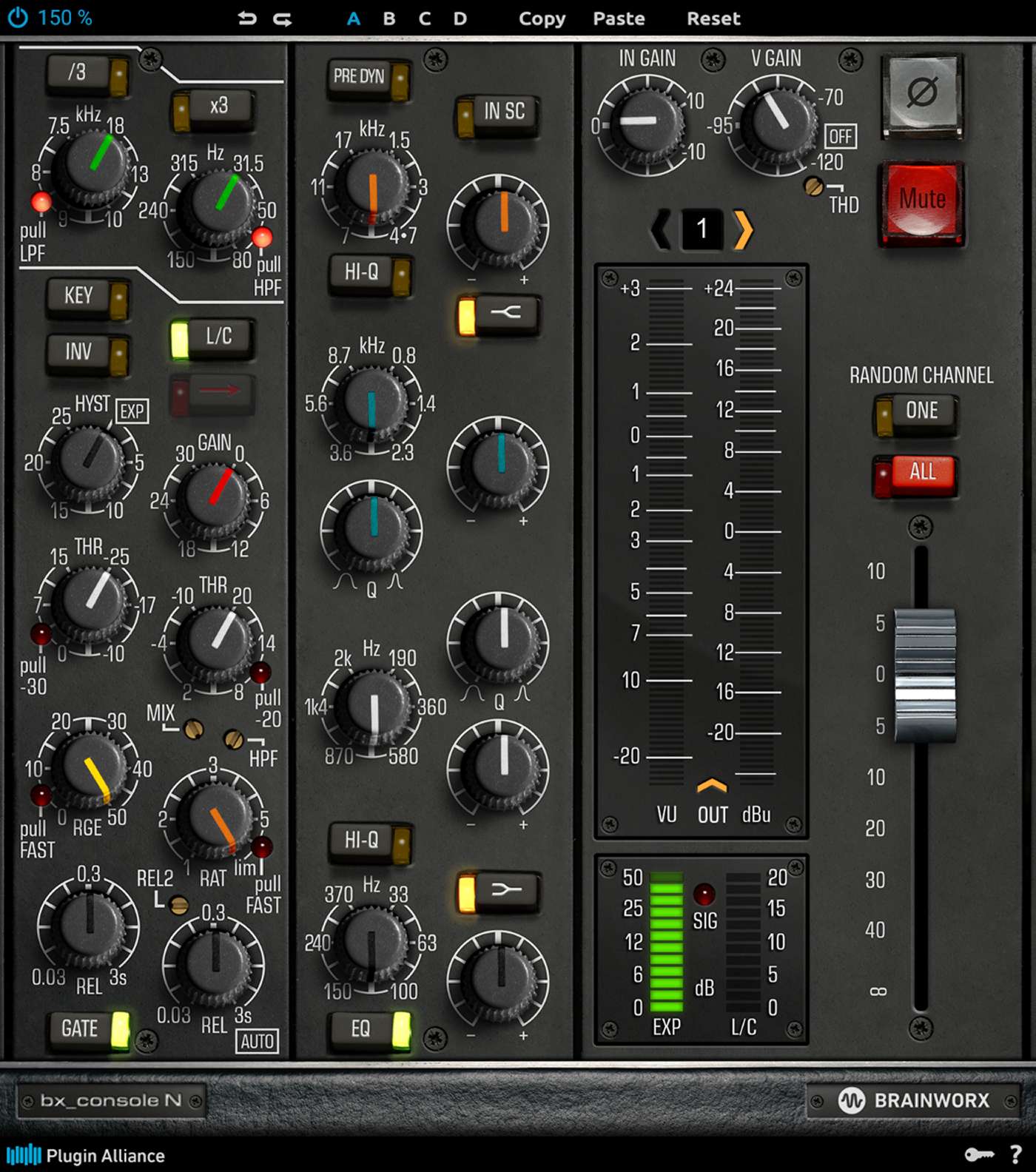 bx_console N:模拟调音台,模拟 Neve® VXS™模拟调音台。它搭载了 Brainworx 标志性的Tolerance Modeling Technology(TMT)技术,能够模拟真实硬件中每个电子元件之间的微小差异,使得每个通道的声音都不完全相同,完美复现模拟设备的自然不一致性。