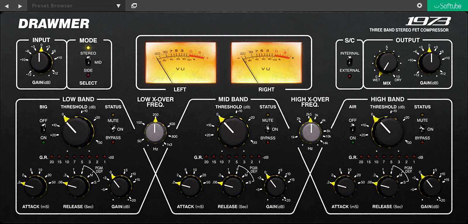 Softube Drawmer 1973:三频段 FET 立体声压缩器。基于经典的 Drawmer 1973 硬件压缩器建模,并获得了原厂(包括 Ivor Drawmer 本人)的认可。忠实还原硬件的“软拐点”(soft knee)压缩曲线和整体音色。它不仅保留了原始硬件温暖、模拟感十足的声音特性,还加入了现代数字功能,如 Mid/Side 处理和外部侧链(External Sidechain)。专为混音和母带处理设计,提供对音频动态的精细控制。