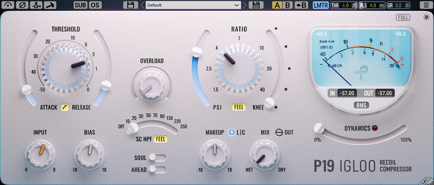 P19 Igloo:具有独特“反冲压缩”机制的立体声峰值压缩器,核心采用创新反冲压缩引擎,可抵消增益衰减,保留音频的冲击力、开阔感和清晰度,尤其适用于重度处理场景。