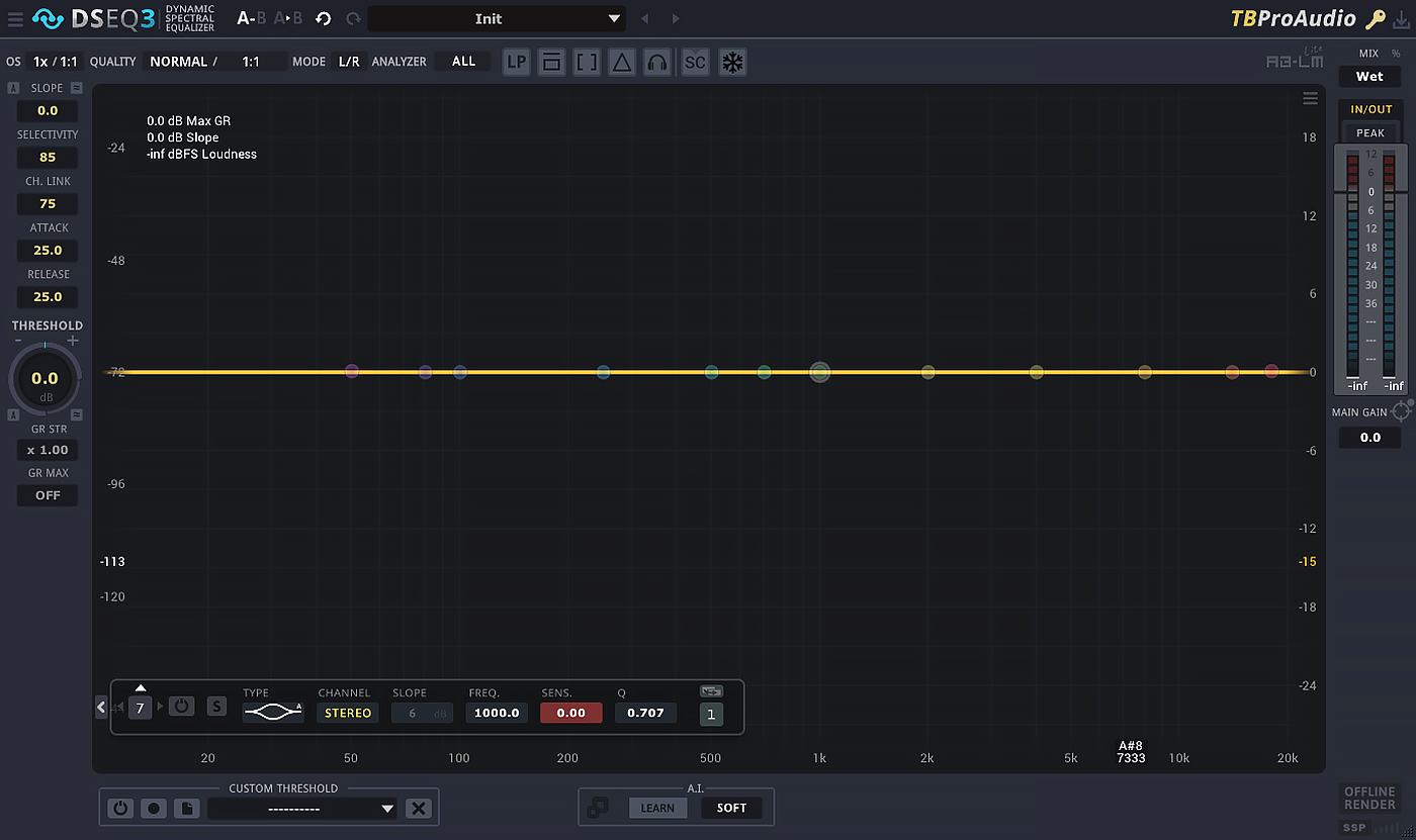TB Pro Audio DSEQ3,动态频谱均衡控制器。主要用于处理音频信号的动态范围,提升音频的清晰度和透明度。动态均衡功能:DSEQ3可以通过减小音频信号中的不必要的频率部分,提升整体音频的清晰度和透明度。自适应阈值和自动增益:该插件具有自适应阈值和自动增益的功能,可以根据音频信号的动态范围进行自动调整,确保音频的平衡和一致性。智能AI功能:DSEQ3引入了智能AI功能和相应的GUI页面,可以根据输入材料自动设置参数,进一步提升了使用的便捷性和效果。