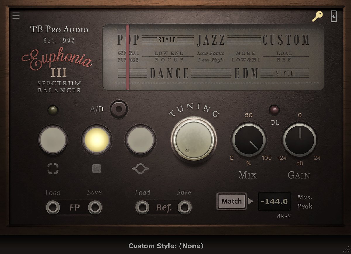 - Euphonia3:频谱平衡插件,自动均衡任何音频输入,使其频谱符合标准的平均曲线,从而获得更清晰的听感,减少“轰鸣声”(boominess),增加“空气感”。