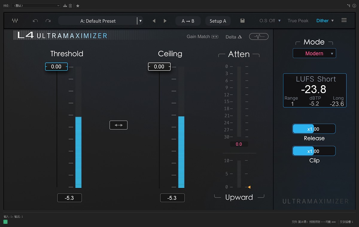 - Threshold:-7(电平提升量:7dB), Out Ceiling:-3(最高输出电平:-3 dBFS)。